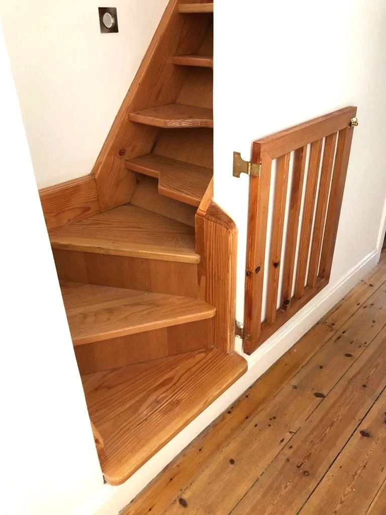 Safety measures included carefully rounded edges for the treads and a custom baby gate; a soundproofing cover and door at the top of the stairs ensured acoustic privacy.