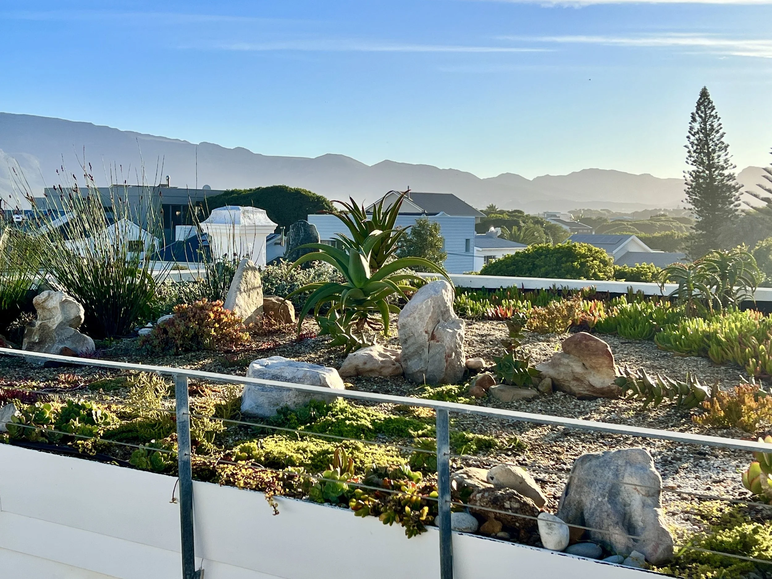 The home incorporates many sustainable design strategies, such as deep overhangs on the north to provide shade in the summer but admit warming rays in the winter; carefully placed, double-glazed windows and polycarbonate walls to maximize natural light, even on the cloudiest days; rainwater harvesting and drought tolerant plants in the garden and on the green roof; and a solar geyser and inverter system to guard against load-shedding.